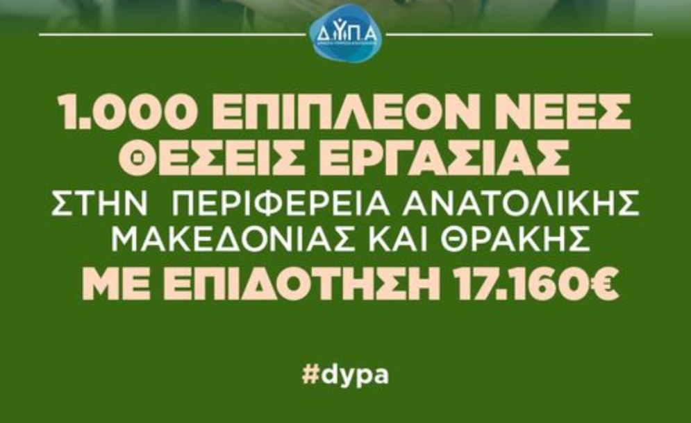 Κατόπιν εκδήλωσης μεγάλου ενδιαφέροντος των επιχειρήσεων για το πρόγραμμα απασχόλησης της ΔΥΠΑ στην Περιφέρεια Ανατολικής Μακεδονίας και Θράκης, αυξήθηκαν κατά 1.000 οι διαθέσιμες νέες θέσεις εργασίας σε συνολικά 2.000.