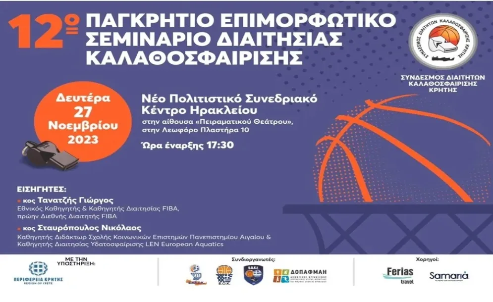 Ο Σύνδεσμος Διαιτητών Καλαθοσφαίρισης Κρήτης με τη στήριξη της Περιφέρειας Κρήτης, της ΕΚΑΣΚ, της ΕΟΚ, της ΟΔΚΕ και του ΔΟΠΦΜΑΗ θα πραγματοποιήσει το 12ο Παγκρήτιο επιμορφωτικό σεμινάριο διαιτησίας καλαθοσφαίρισης. Η εκδήλωση θα γίνει τη Δευτέρα 27 Νοεμβρίου και ώρα 17:30, στο νέο Πολιτιστικό Συνεδριακό Κέντρο Ηρακλείου στην αίθουσα «Πειραματικού Θεάτρου».