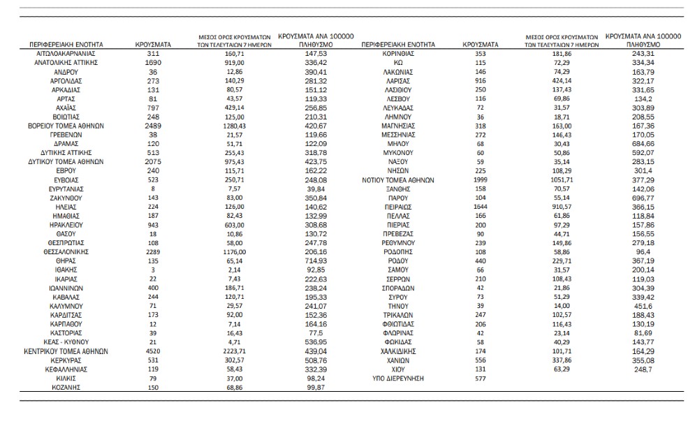 Από το σύνολο των 30.588 νέων κρουσμάτων του νέου ιού στη χώρα 9 είναι εισαγόμενα. Η κατανομή των 30.579 νέων εγχώριων κρουσμάτων ανά Περιφερειακή Ενότητα: