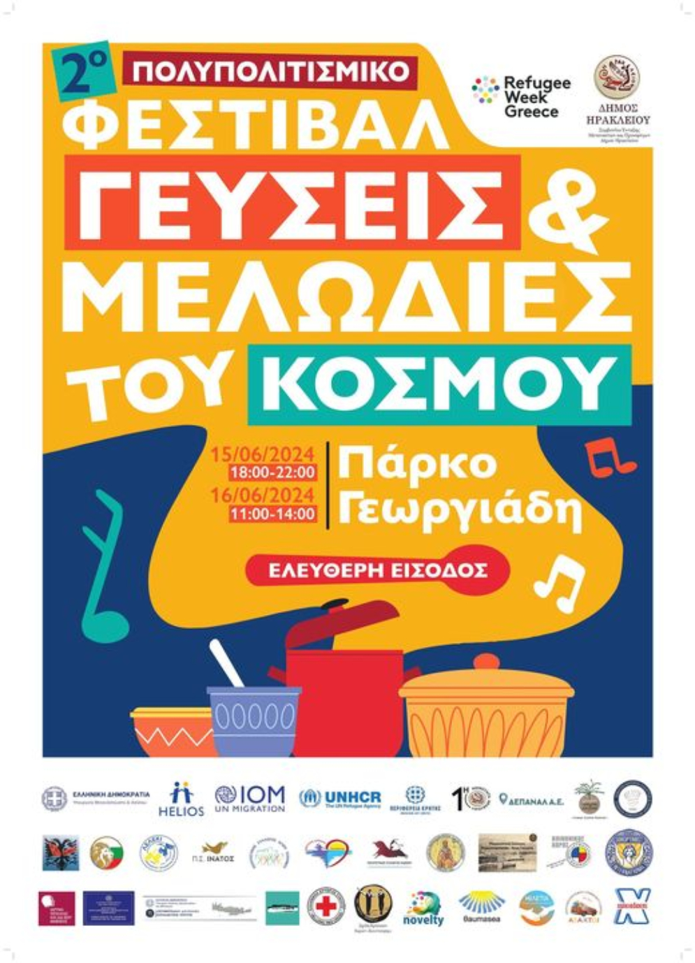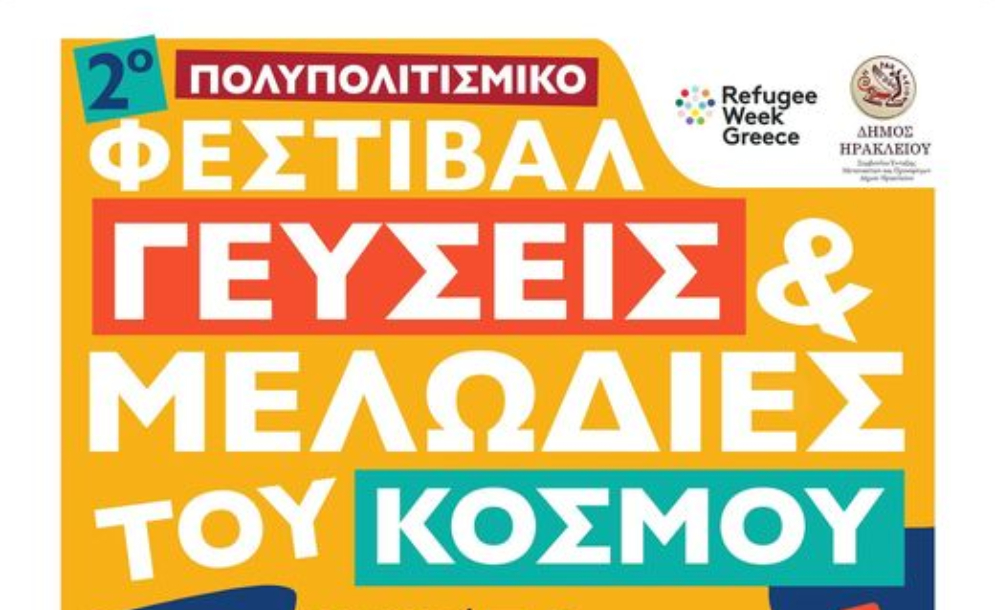 Ο Δήμος Ηρακλείου, ως τιμώμενη πόλη του Φεστιβάλ Refugee Week Greece, διοργανώνει στο Πάρκο Γεωργιάδη το «2ο Πολυπολιτισμικό Φεστιβάλ: Γεύσεις και Μελωδίες του Κόσμου» το Σάββατο 15 Ιουνίου από τις 6 μ.μ. έως τις 10 μ.μ. και την Κυριακή 16 Ιουνίου από τις 11 π.μ. έως τις 2 μ.μ..