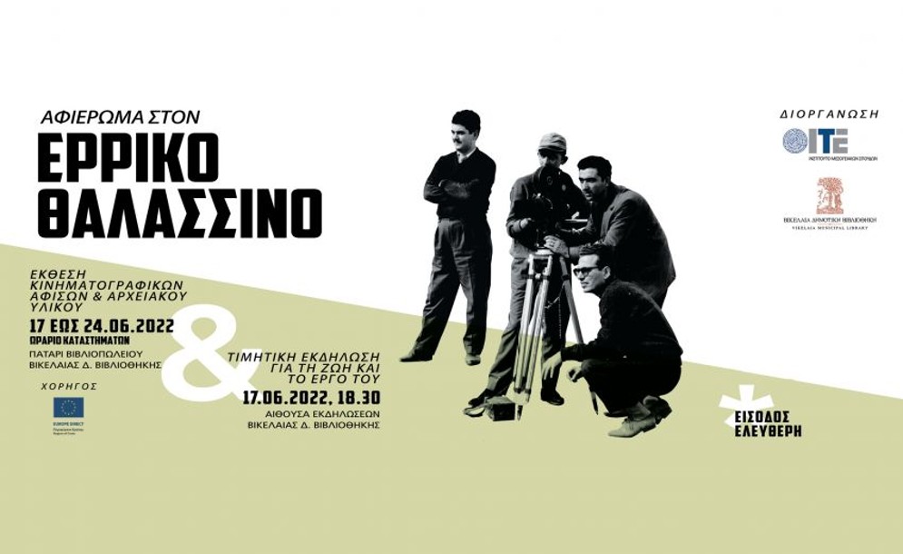 Το Ινστιτούτο Μεσογειακών Σπουδών (ΙΜΣ) του Ιδρύματος Τεχνολογίας και Έρευνας (ΙΤΕ) και η Βικελαία Δημοτική Βιβλιοθήκη, με την υποστήριξη της Europe Direct (Περιφέρεια Κρήτης), συνδιοργανώνουν ΑΦΙΕΡΩΜΑ στον σκηνοθέτη, σεναριογράφο, στιχουργό και ποιητή ΕΡΡΙΚΟ ΘΑΛΑΣΣΙΝΟ, με τιμητική εκδήλωση για τη ζωή και το έργο του και έκθεση κινηματογραφικών αφισών και αρχειακού υλικού, κατόπιν της ευγενικής παραχώρησης της οικογένειας του δημιουργού. Η εκδήλωση θα πραγματοποιηθεί την Παρασκευή, 17 Ιουνίου και ώρα 18:00, στην Αίθουσα Εκδηλώσεων της Βικελαίας Δημοτικής Βιβλιοθήκης Ηρακλείου.