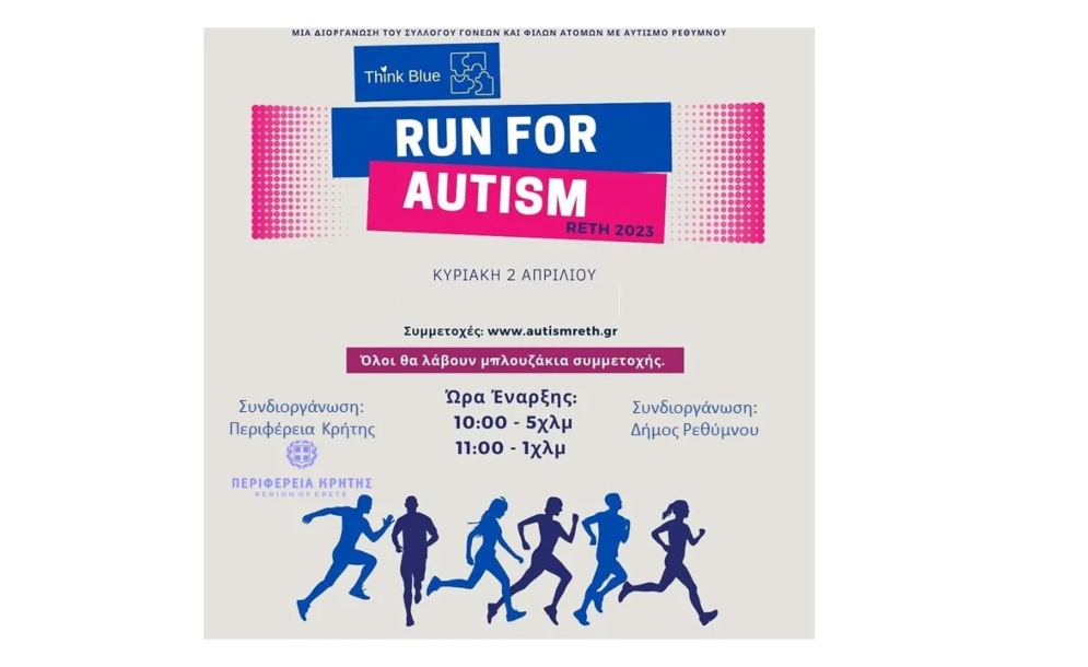 Ο σύλλογος γονέων και φίλων ατόμων με αυτισμό οργανώνει με την υποστήριξη της Περιφέρειας Κρήτης και του δήμου Ρεθύμνου, τον αγώνα δρόμου με τίτλο «Τρέχω για τον αυτισμό στο Ρέθυμνο». Ο αγώνας θα πραγματοποιηθεί την Κυριακή 2 Απρίλιου και ώρα 10.30 π.μ., με εκκίνηση στη πλατεία του Αγνώστου Στρατιώτη.