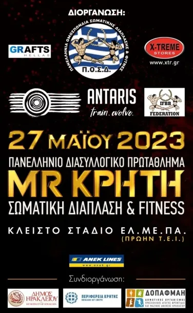 Ο αθλητικός σύλλογος Ηρακλείου «ΑΝΤΑΡΗΣ» με την υποστήριξη της Πανελλήνιας Ομοσπονδίας Σωματικής Διάπλασης και Φίτνες, της Περιφέρειας Κρήτης και του Δήμου Ηρακλείου – ΔΟΠΑΦΜΑΗ πραγματοποιούν το διασυλλογικό πρωτάθλημα σωματικής διάπλασης και φίτνες «Mr ΚΡΗΤΗ». Η διοργάνωση θα πραγματοποιηθεί το Σάββατο 27 Μαΐου και ώρα 16:00 στο κλειστό γήπεδο ΕΛΜΕΠΑ.