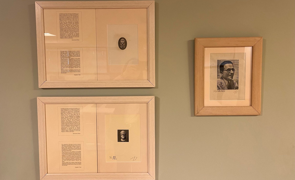Πρόκειται για μια χαλκογραφία εν αναμονή με την κεφαλή του Αριστοτέλη, μια χαλκογραφία εν αναμονή με την κεφαλή του Αισχύλου και μια ξυλογραφία σε όρθιο ξύλο με την κεφαλή του Ιωάννη Συκουτρή. Τα έργα τα οποία δημιουργήθηκαν προκειμένου να χρησιμοποιηθούν σε χαρτονομίσματα και βρίσκονται σε κατάσταση αναμονής, κοσμούν ήδη το χώρο του Αναγνωστηρίου της Βιβλιοθήκης στο Τμήμα Εσωτερικού Δανεισμού.