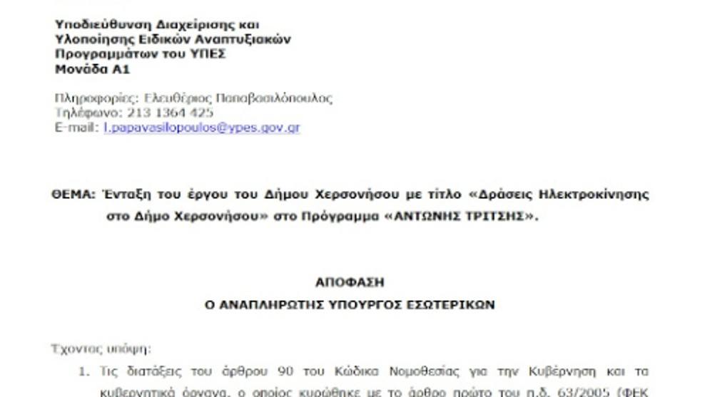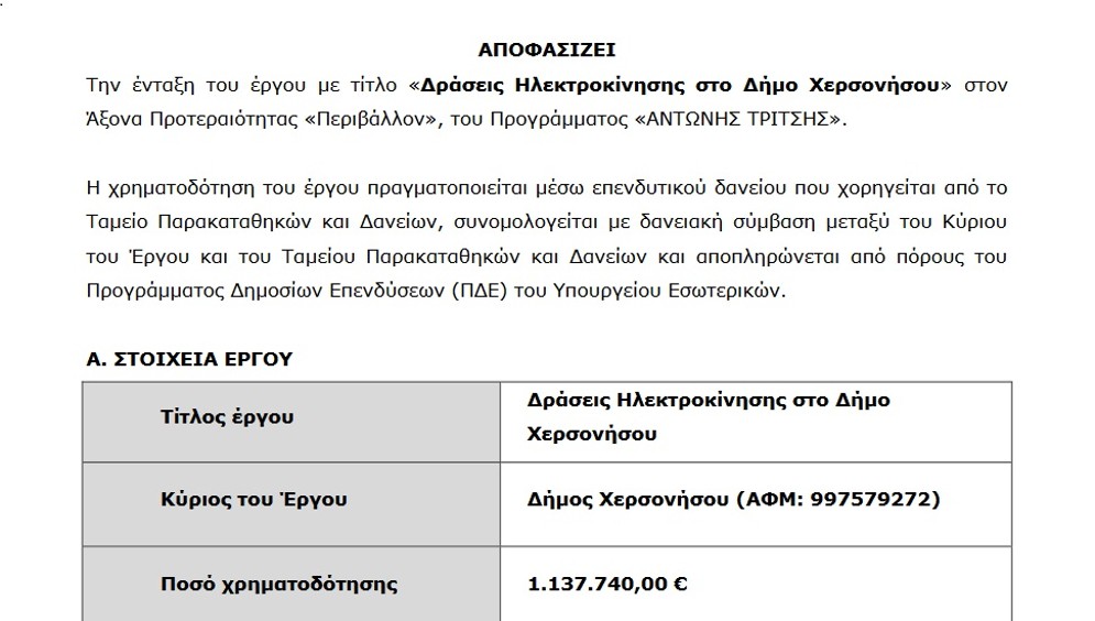 Στο πρόγραμμα «Αντώνης Τρίτσης» του Υπουργείου Εσωτερικών εντάχθηκε η πρόταση του Δήμου Χερσονήσου για την ανάπτυξη της Ηλεκτροκίνησης μέσω της προμήθειας ηλεκτροκίνητων οχημάτων και σταθμών φόρτισης.
