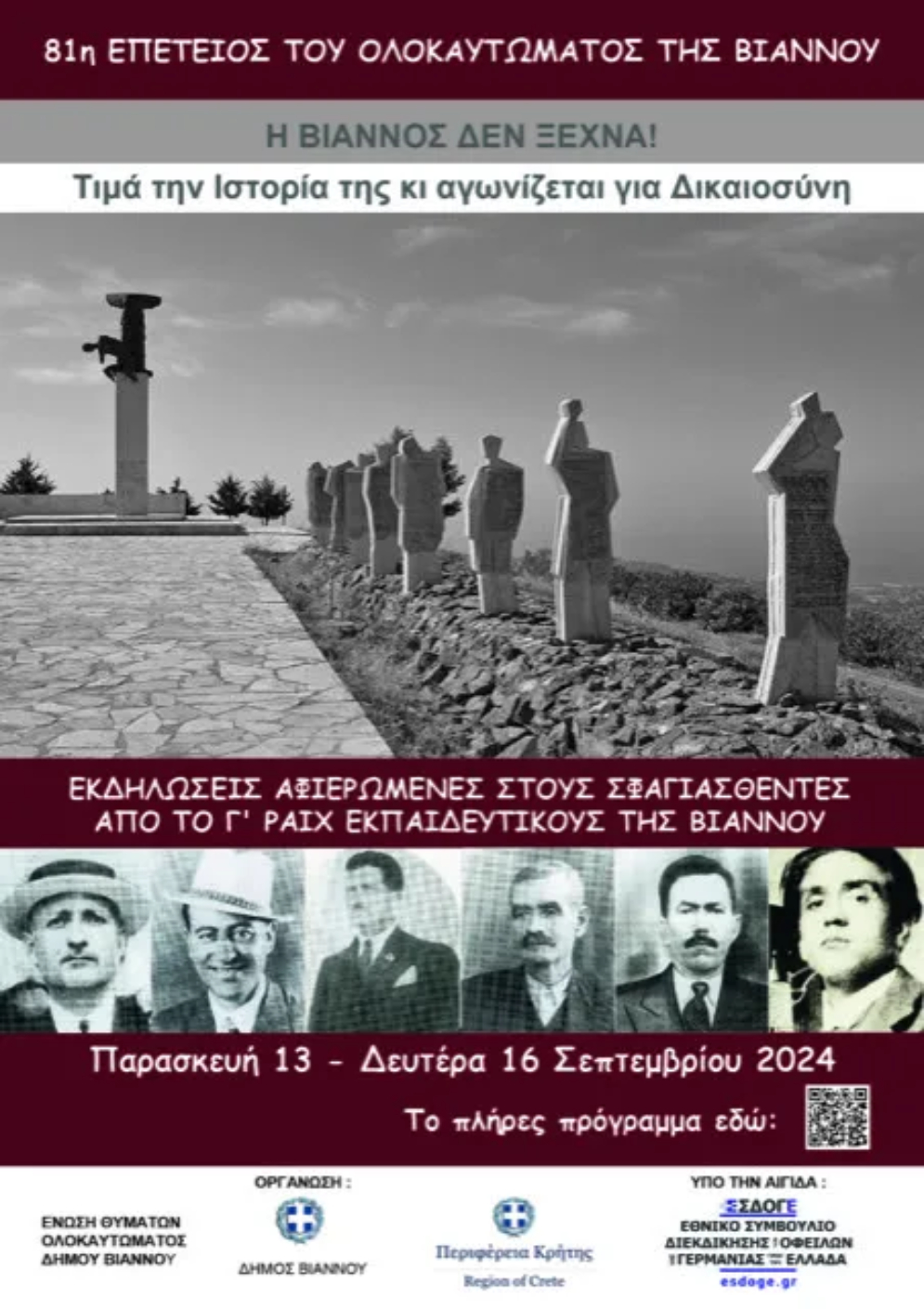 ΟΡΓΑΝΩΣΗ ΕΚΔΗΛΩΣΕΩΝ: Περιφέρεια Κρήτης, Δήμος Βιάννου και Ένωση Θυμάτων Ολοκαυτώματος Δήμου Βιάννου.