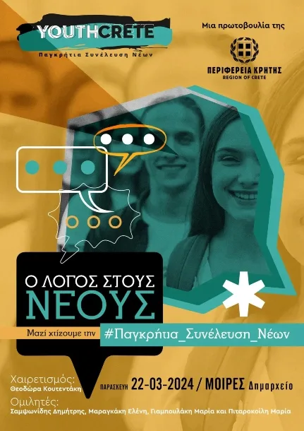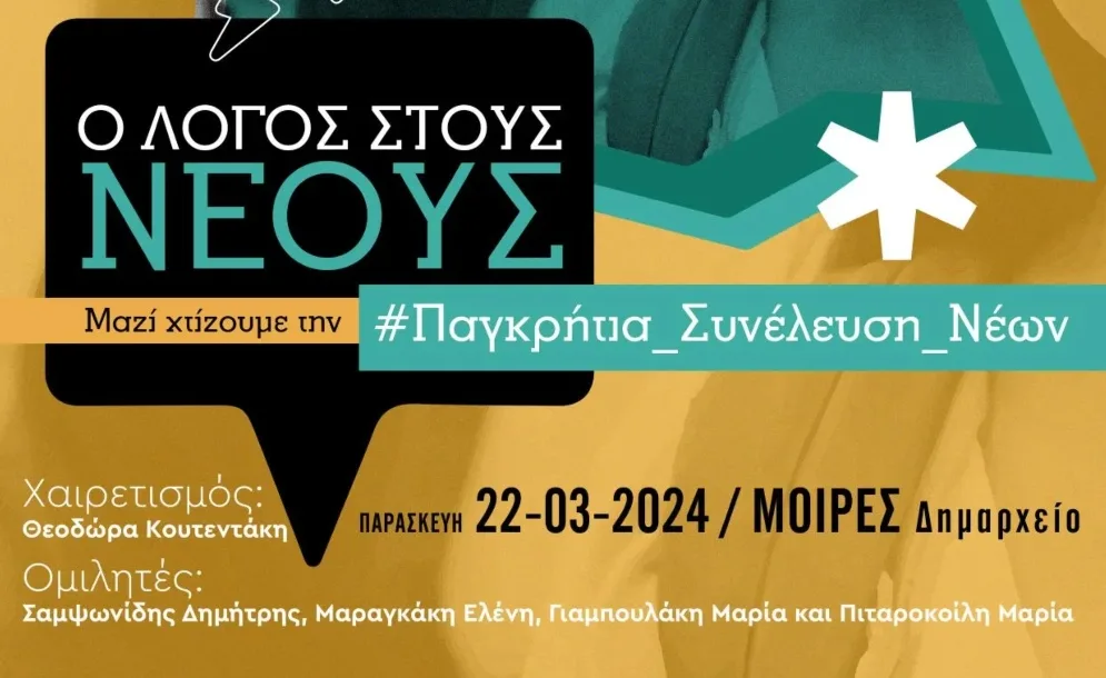 Στο πλαίσιο αυτό θα πραγματοποιηθεί η πρώτη ανοιχτή εκδήλωση της Παγκρήτιας Συνέλευσης Νέων την Παρασκευή 22 Μαρτίου και ώρα 19:00 στις Μοίρες, σε συνεργασία με το δήμο Φαιστού.