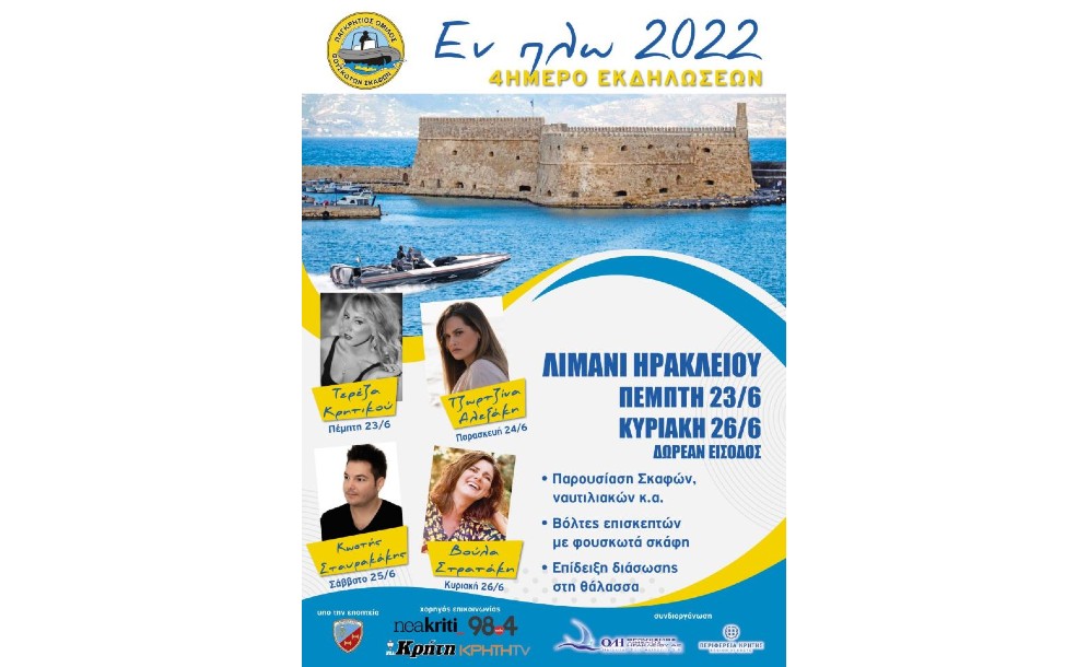Από την Πέμπτη 23 Ιουνίου έως και την Κυριακή 26 Ιουνίου 2022 θα πραγματοποιηθεί για 6η φορά στο Ηράκλειο το τετραήμερο Έκθεσης ναυτιλιακών και άλλων ειδών, και αφορά στην πρόληψη και ασφάλεια στη θάλασσα.