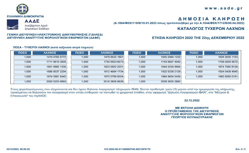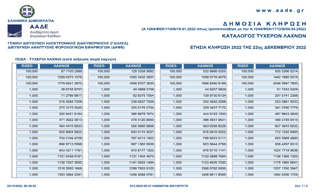 Δώδεκα τυχεροί λαχνοί που κερδίζουν χρηματικό έπαθλο 100.000 ευρώ έκαστος