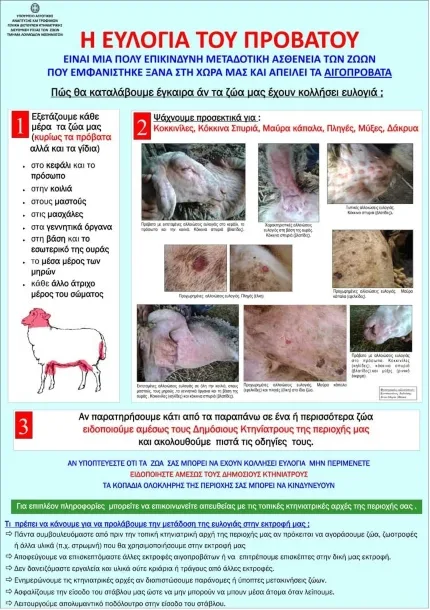 Υπενθυμίζεται ότι ο ιός της Ευλογιάς των προβάτων και των αιγών ΔΕΝ ΜΕΤΑΔΙΔΕΤΑΙ ΣΤΟΝ ΑΝΘΡΩΠΟ ΚΑΙ ΔΕΝ ΕΧΕΙ ΚΑΜΙΑ ΣΧΕΣΗ ΜΕ ΤΗ ΔΗΜΟΣΙΑ ΥΓΕΙΑ.