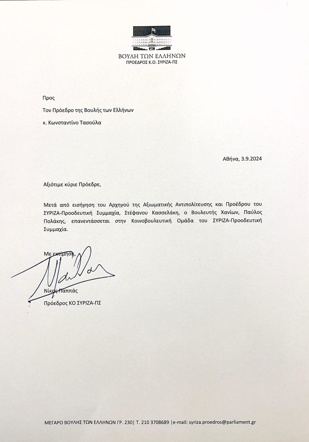 Με απόφαση του προέδρου του ΣΥΡΙΖΑ-Προοδευτική Συμμαχία, Στέφανου Κασσελάκη, ο βουλευτής Χανίων, Παύλος Πολάκης, επανεντάσσεται στην Κοινοβουλευτική Ομάδα του κόμματος. Η σχετική επιστολή έχει φτάσει ήδη στο γραφείο του Προέδρου της Βουλής, ανέφερε σε δήλωσή του στους δημοσιογράφους τη Δευτέρα το πρωί στη Βουλή ο Πρόεδρος της Κ.Ο. του ΣΥΡΙΖΑ-Προοδευτική Συμμαχία και Βουλευτής, Νίκος Παππάς.