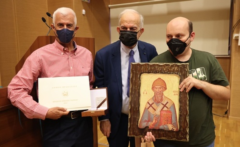 Ακολούθησε η βράβευση από τον Δήμαρχο με μετάλλιο ειδικά φιλοτεχνημένο και με τιμητικό φάκελο, ενώ ο κ. Τζαμούσης δώρισε εκ μέρους του Κέντρου Ειδικών Παιδιών στον Δήμαρχο μια εικόνα του Αγίου Σπυρίδωνα.