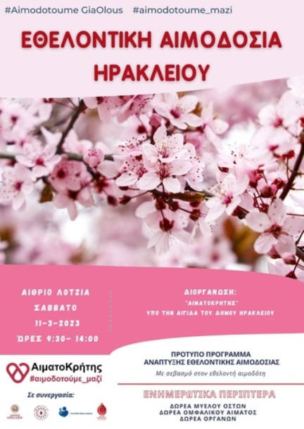Εθελοντική αιμοδοσία θα πραγματοποιηθεί το Σάββατο 11/03/2023 στο κέντρο της πόλης του Ηρακλείου και συγκεκριμένα στο αίθριο της Λότζια από τις 9:30 έως τις 14:00 .