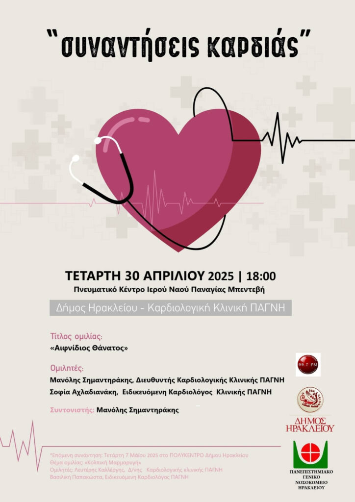 Υπενθυμίζεται ότι στις «Συναντήσεις Καρδιάς» που έχουν ως στόχο την πρόληψη και την ενημέρωση του κοινού γύρω από τα καρδιολογικά προβλήματα, διακεκριμένοι καρδιολόγοι προσφέρουν πολύτιμες πληροφορίες για την πρόληψη αλλά και για την καλύτερη αντιμετώπιση των καρδιολογικών νοσημάτων τα οποία αποτελούν την πρώτη αιτία θανάτου. Οι ομιλίες, με ελεύθερη συμμετοχή για το κοινό, θα πραγματοποιούνται μία φορά το μήνα εκ περιτροπής στο κέντρο του Ηρακλείου και στην περιφέρεια της πόλης.