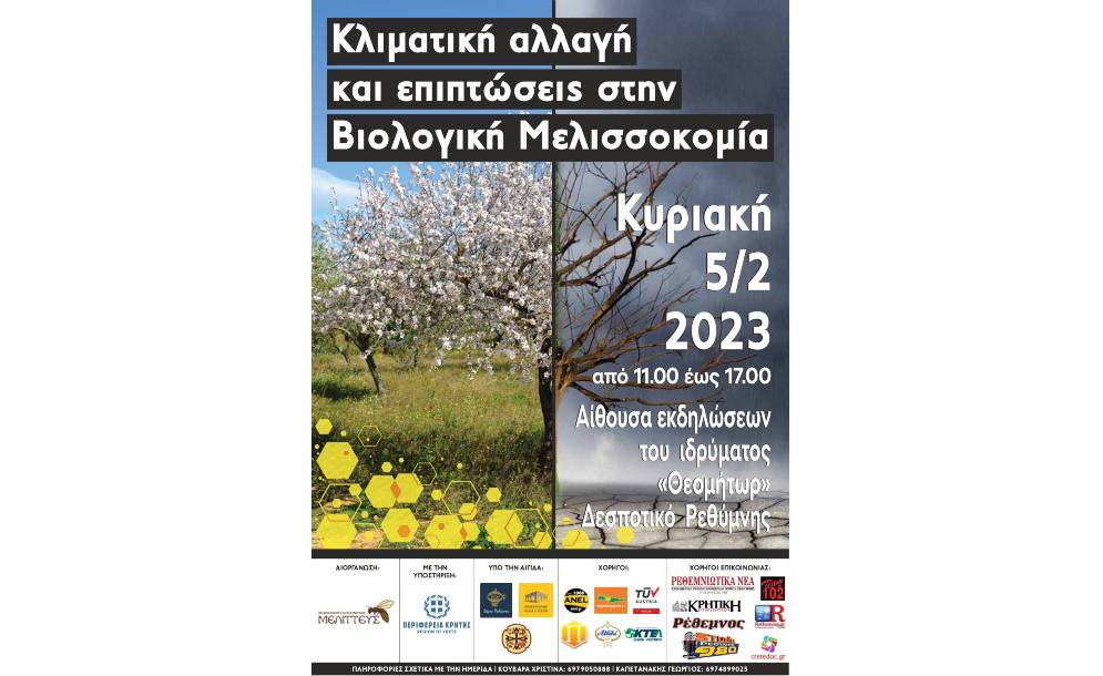 Ημερίδα του Μελισσοκομικού Συλλόγου Ρεθύμνης «ΜΕΛΙΤΤΕΥΣ» με θέμα «Κλιματική αλλαγή και επιπτώσεις στην Βιολογική Μελισσοκομία» θα πραγματοποιηθεί την Κυριακή 5 Φεβρουαρίου 2023 από 11.00 έως 17.00 στην αίθουσα εκδηλώσεων του ιδρύματος «Θεομήτωρ» – Δεσποτικό Ρεθύμνης