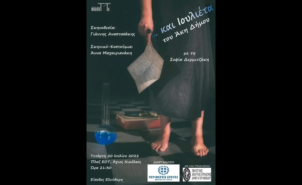 Η MoueTTe Theatre Group παρουσιάζει τον μονόλογο του Άκη Δήμου «…και Ιουλιέτα», στην Πλαζ ΕΟΤ Αγίου Νικολάου, στις 20 Ιουλίου και ώρα 21:30, σε σκηνοθεσία Γιάννη Αναστασάκη και Σκηνικό – Κοστούμια Άννας Μαχαιριανάκη. Ερμηνεύει η Σοφία Δερμιτζάκη. Η παράσταση πραγματοποιείται με την στήριξη της Περιφέρειας Κρήτης.