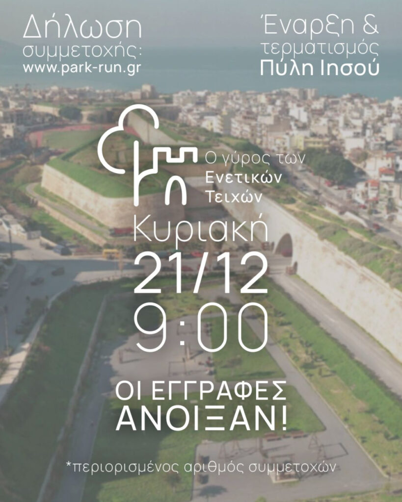 Ο γύρος των Ενετικών Τειχών «Parkrun Heraklion» είναι ένας νέος αγώνας 5 χιλιομέτρων με ελεύθερη συμμετοχή για όλους, ανεξαρτήτως αθλητικού επιπέδου, που θα διεξάγεται μια φορά τον μήνα στα Τείχη. Σταθερό σημείο αφετηρίας και τερματισμού θα είναι ο προμαχώνας της Πύλης Ιησού και η διαδρομή μέχρι τον Προμαχώνα του Αγίου Ανδρέα, με περάσματα και από σημεία της τάφρου, θα προσφέρει μια εμπειρία που θα συνδυάζει άσκηση, θέα, ιστορία και επαφή των πολιτών με το πιο εμβληματικό μνημείο του Ηρακλείου.