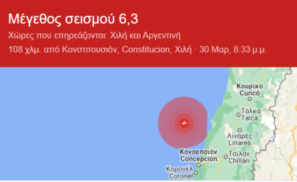 Ισχυρός σεισμός σημειώθηκε στα ανοικτά των ακτών της περιφέρειας Μάουλε, στη βόρεια Χιλή λίγο πριν τις 21:00 ώρα Ελλάδας τη Πέμπτη.