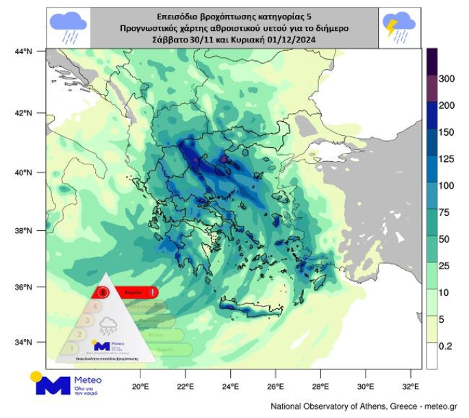 Επισημαίνεται ότι συνολικά το διήμερο Σάββατο 30/11 και Κυριακή 01/12, πολύ μεγάλα ύψη βροχής αναμένονται κατά τόπους στην Ανατολική Θεσσαλία, στους νομούς Πιερίας, Ημαθίας, Πέλλας, Χαλκιδικής και ενδεχομένως στις Σποράδες και στη Δυτική Κρήτη. Σημαντικά θα είναι τα ύψη βροχής και σε πολλές ακόμα περιοχές.
