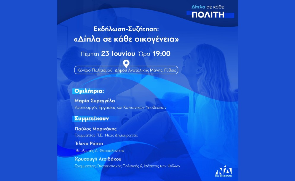 Την Πέμπτη 23 Ιουνίου και ώρα 19:00, στον νομό Λακωνίας και συγκεκριμένα στο Κέντρο Πολιτισμού Δήμου Ανατολικής Μάνης θα πραγματοποιηθεί μια ακόμα εκδήλωση-συζήτηση με θέμα «Δίπλα σε κάθε πολίτη: Δίπλα σε κάθε οικογένεια».