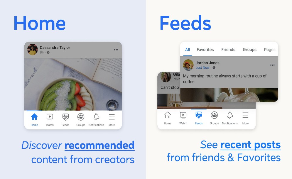 Mark Zuckerberg just announced a Feeds tab on @facebook, where you can see a chronological feed of posts from those you follow. And when you open Facebook, you’ll still see a Home tab where we’ll recommend personalized content from creators and friends.https://t.co/nLA7hgclGK pic.twitter.com/Ajy2knHL70