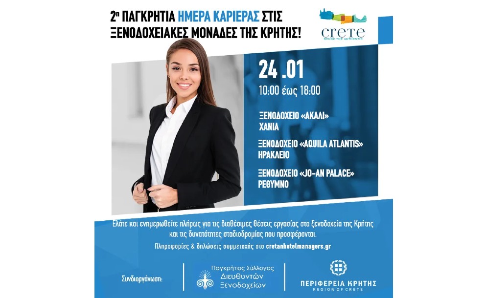 Ο Παγκρήτιος Σύλλογος Διευθυντών Ξενοδοχείων και η Περιφέρεια Κρήτης, αναγνωρίζοντας τη σημασία που έχει ο Τουρισμός στην Κρήτη, αλλά και οι μεγάλες δυνατότητες που προσφέρει ο ξενοδοχειακός κλάδος του νησιού μας στον τομέα της εργασίας, συνδιοργανώνουν την «2η Παγκρήτια ημέρα καριέρας στις Ξενοδοχειακές μονάδες της Κρήτης».