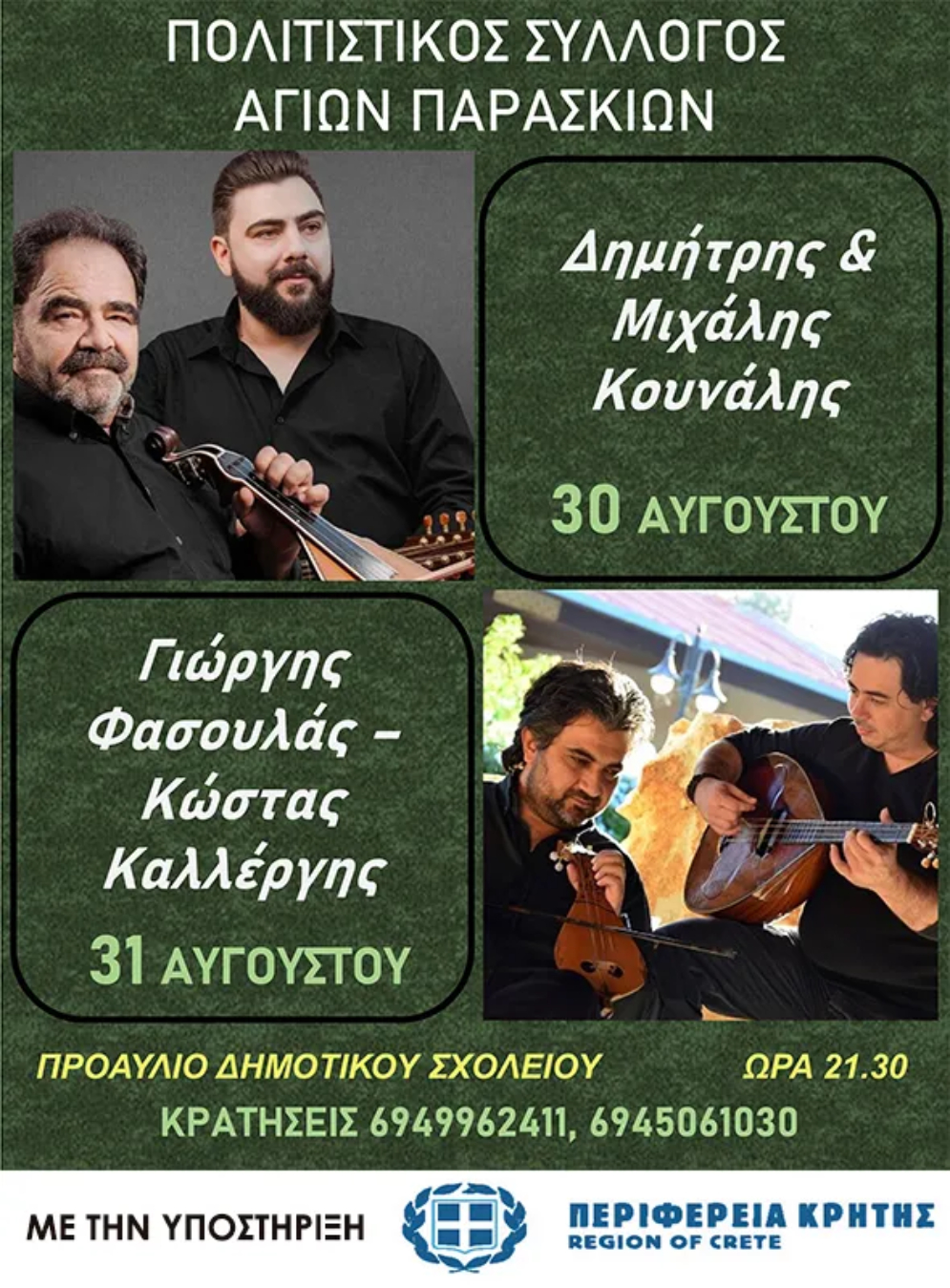 Ο Πολιτιστικός Σύλλογος Καλλονής διοργανώνει εκδήλωση με τη στήριξη της Περιφέρειας Κρήτης η οποία θα πραγματοποιηθεί στις 31/8/2024 στη Καλλονή Ηρακλείου. Θα παίξει το συγκρότημα παραδοσιακής μουσικής με τους: Βερεράκη Δημήτρη ( Λύρα – Φωνή ), Αντώνη Αποστολάκη ( Λαούτο ), Δημήτρη Αντωνίου Αποστολάκη ( Λαούτο – Φωνή ) και Χριστόφορο Μαυρογιαννάκη ( Κιθάρα). Η εκδήλωση θα πραγματοποιηθεί στην πλατεία του χωριού με ώρα έναρξης 21:30.