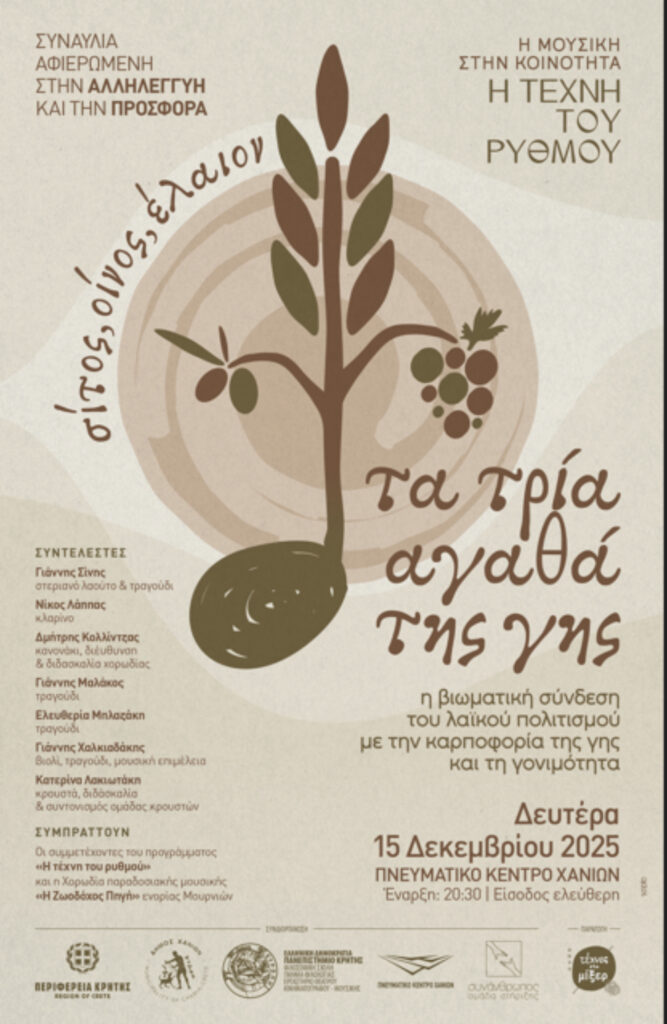 Η βιωματική σύνδεση του λαϊκού μας πολιτισμού με την καρποφορία της γης και τη γονιμότητα αναδεικνύεται μέσα από τις Μουσικές και τα Τραγούδια Συναυλίας αφιερωμένης στην Αλληλεγγύη και την Προσφορά που θα πραγματοποιηθεί τη Δευτέρα 15 Δεκεμβρίου 2025, ώρα 20.30, στο Πνευματικό Κέντρο Χανίων.