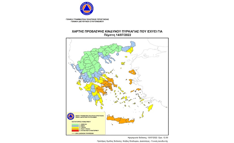 Η Πολιτική Προστασία Περιφέρειας Κρήτης ενημερώνει ότι, σύμφωνα με τον Ημερήσιο Χάρτη Πρόβλεψης Κινδύνου Πυρκαγιάς της Γενικής Γραμματείας Πολιτικής Προστασίας για σήμερα Πέμπτη 14 Ιουλίου 2022 η κατηγορία Κινδύνου Πυρκαγιάς για το σύνολο της Κρήτης , είναι: 4 (πολύ υψηλός).
