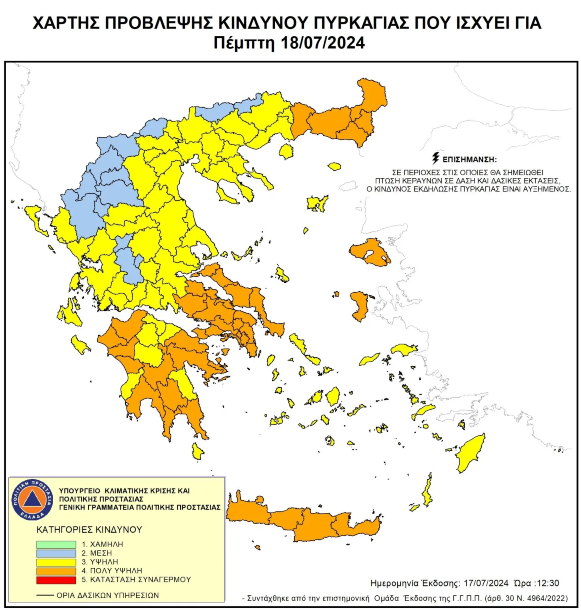 Η Πολιτική Προστασία Περιφέρειας Κρήτης ενημερώνει ότι, σύμφωνα με τον ημερήσιο Χάρτη Πρόβλεψης Κινδύνου Πυρκαγιάς της Γενικής Γραμματείας Πολιτικής Προστασίας για Πέμπτη 18 Ιουλίου 2024 η κατηγορία Κινδύνου Πυρκαγιάς για όλη την Κρήτη, είναι κατηγορίας κινδύνου 4 (πολύ υψηλός).