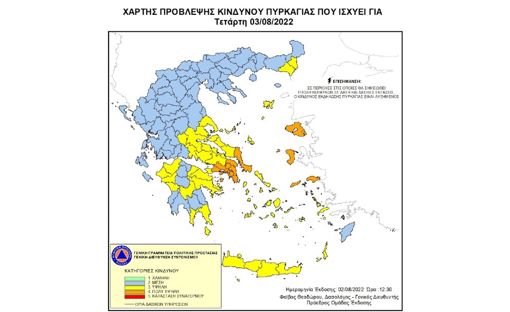 Σύμφωνα με το Χάρτη Πρόβλεψης Κινδύνου Πυρκαγιάς που εκδίδει η Γενική Γραμματεία Πολιτικής Προστασίας του Υπουργείου Κλιματικής Κρίσης & Πολιτικής Προστασίας (www.civilprotection.gr), για τη Τετάρτη 03 Αυγούστου 2022, προβλέπεται πολύ υψηλός κίνδυνος πυρκαγιάς (κατηγορία κινδύνου 4) για τις εξής περιοχές: