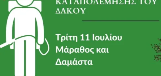Παρακαλούνται όσοι ελαιοπαραγωγοί έχουν περιφραγμένα ελαιόφυτα να μεριμνήσουν ώστε ο εργολάβος ψεκασμού να έχει πρόσβαση στα δένδρα τους για να μπορεί να τα ψεκάσει και οι βιοκαλλιεργητές να σημαδέψουν τα ελαιόφυτά τους για να αποφευχθεί ανεπιθύμητος ψεκασμός.