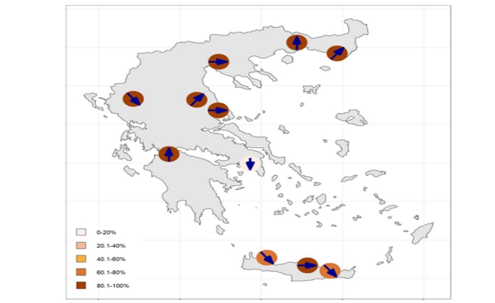 Η χρωματική κλίμακα από ελαφριά έως έντονη απόχρωση (από το ροζ/μπεζ έως το βαθύ κόκκινο/καφέ) δείχνει, για κάθε πόλη/περιοχή, τα επίπεδα του SARS-CoV-2 στα αστικά λύματα την τελευταία εβδομάδα σε σχέση με τα ιστορικά δεδομένα της πόλης/περιοχής (από 01/06/2021 και μετά). Για παράδειγμα, όταν μια πόλη/περιοχή χαρακτηρίζεται με ροζ /μπεζ χρώμα (0-20%), τα επίπεδα του ιικού φορτίου στα αστικά λύματα στις μετρήσεις της τελευταίας εβδομάδας ανήκουν στο χαμηλότερο 20% των συνολικών μετρήσεών της, ενώ όταν χαρακτηρίζεται με βαθύ κόκκινο (80.1-100%), τα επίπεδα του ιικού φορτίου στα αστικά λύματα στις μετρήσεις της τελευταίας εβδομάδας ανήκουν στο υψηλότερο 20% των συνολικών μετρήσεών της. Τα βέλη μέσα στους κύκλους δείχνουν την τάση στην εβδομαδιαία ποσοστιαία μεταβολή, όπως φαίνεται και στον πίνακα 1.