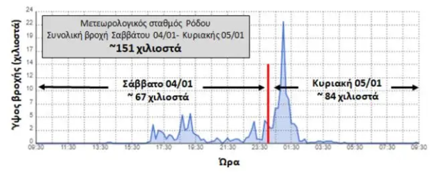 Σημειώνεται ότι μεγάλα ύψη βροχής καταγράφηκαν από το πρωί του Σαββάτου 04/01 και στον σταθμό της Λίνδου, στα ανατολικά του νησιού (65.6 χιλιοστά).