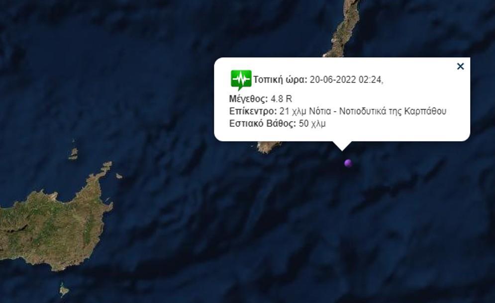 Σεισμός σημειώθηκε το πρωί της Δευτέρας στην Κάρπαθο κοντά,με το επίκεντρο του σεισμού να εντοπίζεται μόλις 21 χιλιόμετρα νότια-νοτιοδυτικά του νησιού.