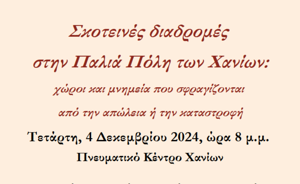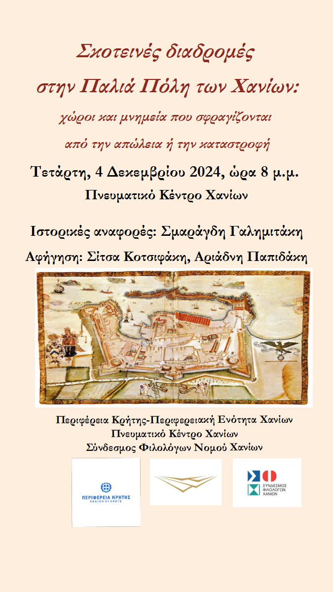Ο Σύνδεσμος Φιλολόγων Νομού Χανίων (Σ.Φ.Ν.Χ.) σε συνδιοργάνωση με την Περιφέρεια Κρήτης-Περιφερειακή Ενότητα Χανίων και το Πνευματικό Κέντρο Χανίων πραγματοποιεί εκδήλωση την Τετάρτη, 4 Δεκεμβρίου 2024, ώρα 8 μ.μ. στο Πνευματικό Κέντρο με θέμα “Σκοτεινές διαδρομές στην Παλιά Πόλη των Χανίων”.