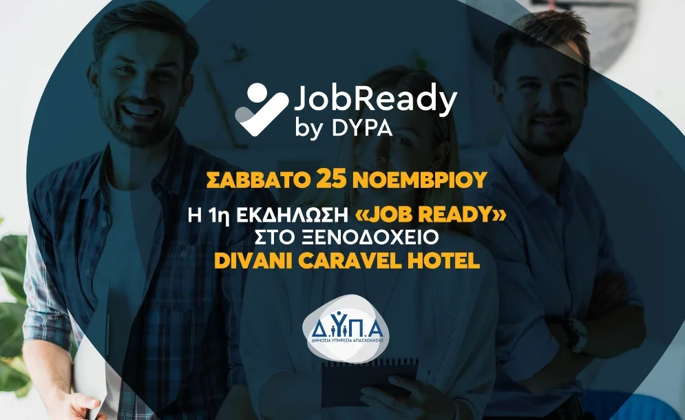 Η Δημόσια Υπηρεσία Απασχόλησης (ΔΥΠΑ) διοργανώνει την πρώτη εκδήλωση «Job Ready by DYPA» το Σάββατο, 25 Νοεμβρίου 2023, στο ξενοδοχείο Divani Caravel Hotel (Λεωφ. Βασιλέως Αλεξάνδρου 2, Αθήνα 161 21), από τις 10:00 έως τις 18.00.