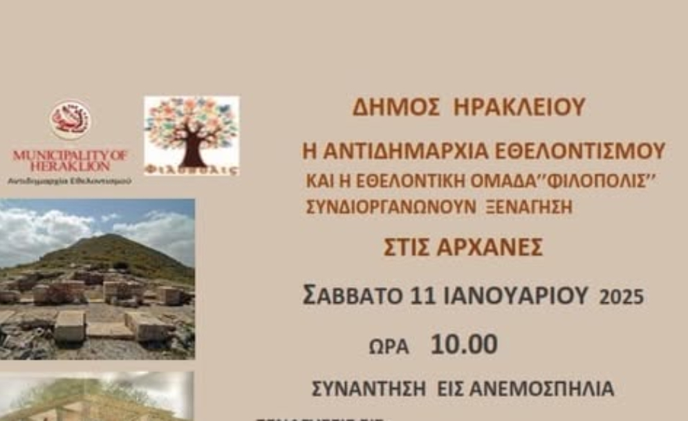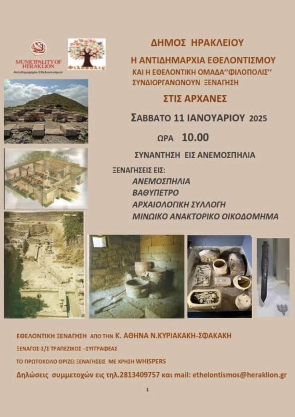 Η πρώτη ξενάγηση του 2025 για τις “Χαρτοδιαδρομές…στο Δήμο μας” θα πραγματοποιηθεί το Σάββατο 11 Ιανουαρίου στις αρχαιότητες των Αρχανών, στο πλαίσιο του δεύτερου κύκλου των δωρεάν ξεναγήσεων που εγκαινίασε ο Δήμος Ηρακλείου και η Αντιδημαρχία Εθελοντισμού σε συνεργασία με την Ομάδα «Φιλόπολις» και την εθελοντική προσφορά της ξεναγού Αθηνάς Κυριακάκη- Σφακάκη.