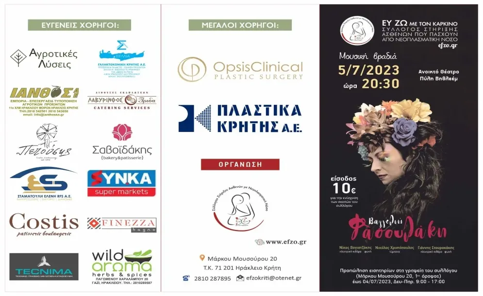 Η ετήσια καλοκαιρινή συναυλία που διοργανώνει ο Σύλλογος στήριξης ασθενών με νεοπλασματική νόσο «Ευ Ζω με τον Καρκίνο», φέτος είναι γεμάτη κέφι και αισιοδοξία! Κοντά μας θα είναι η εξαιρετική ερμηνεύτρια και performer Βαγγελιώ Φασουλάκη, μαζί με τους μουσικούς Νίκο Βογιατζάκη, Γιάννη Σταυρακάκη και Νικόλα Χριστόπουλο, που θα μας χαρίσουν μια όμορφη καλοκαιρινή μουσική βραδιά την Τετάρτη 5 Ιουλίου 2023, στο ανοικτό θέατρο Πύλη Βηθλεέμ.