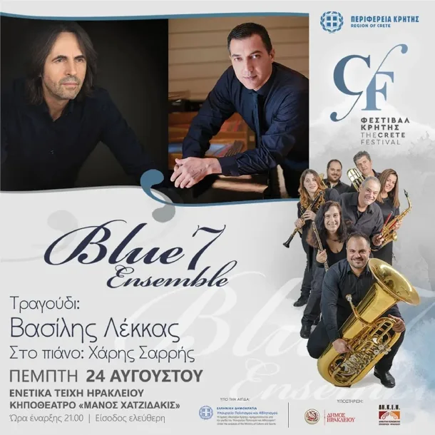 Το « Φεστιβάλ Κρήτης» που διοργανώνει η Περιφέρεια Κρήτης, για τρίτη χρονιά φέτος, υπό την αιγίδα του υπουργείου Πολιτισμού, παρουσιάζει την Πέμπτη 24 Αυγούστου και ώρα 21:00 στα Ενετικά τείχη Ηρακλείου – κηποθέατρο «Μάνος Χατζιδάκις», μια συναυλία με το Blue7 ensemble, ένα νέο μουσικό σχήμα που λόγω της σύνθεσής του, είναι πρωτότυπο.