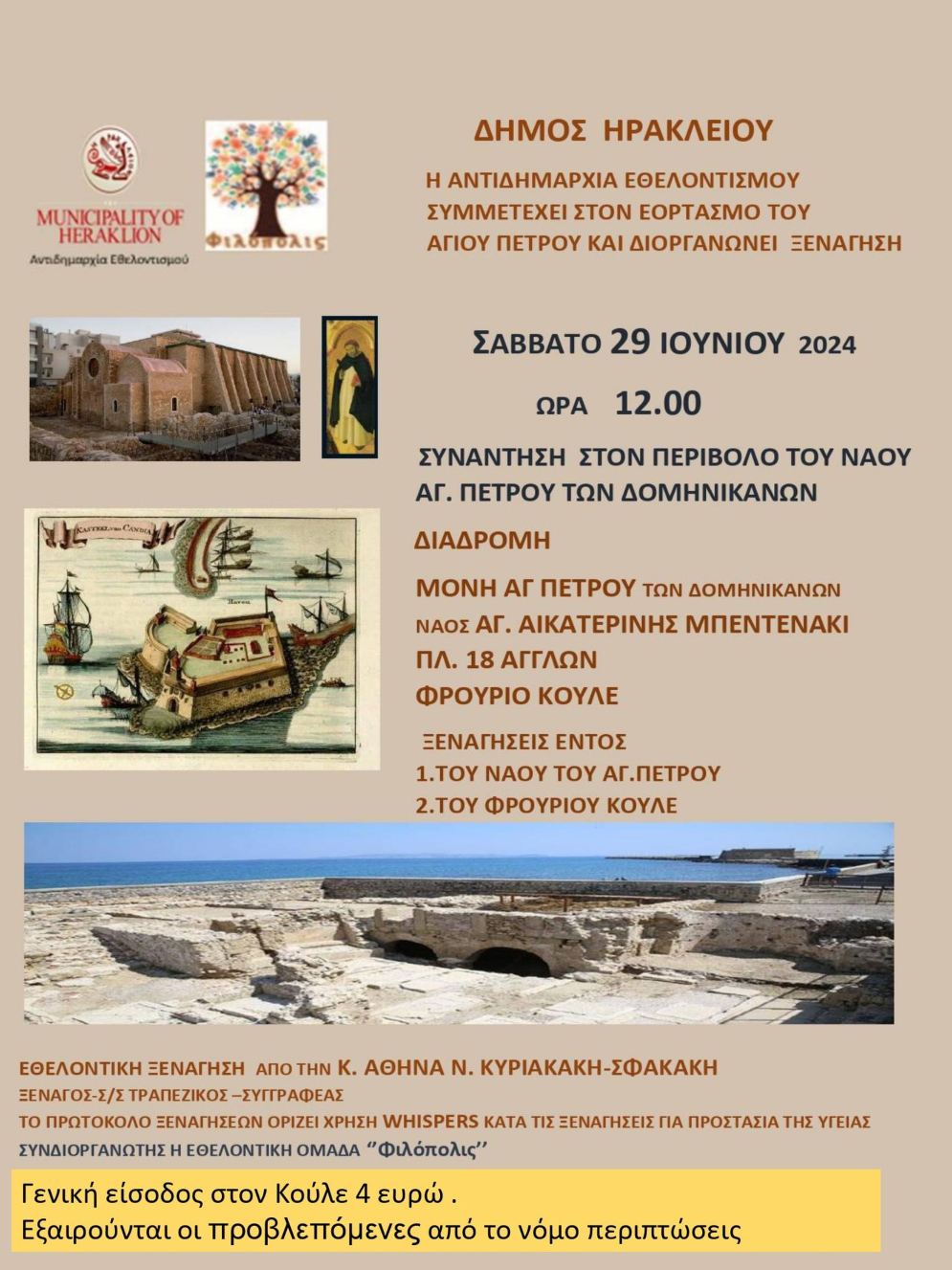 Από το Ναό του Αγίου Πέτρου των Δομηνικανών στις 12:00 το μεσημέρι το Σάββατο 29 Ιουνίου θα ξεκινήσει η ξενάγηση στο Ηράκλειο στα πλαίσια του κύκλου δράσεων «Χαρτοδιαδρομές… στο Δήμο μας» τον οποίο διοργανώνει ο Δήμος Ηρακλείου – Αντιδημαρχία Εθελοντισμού με τη συνεργασία της Εθελοντικής ομάδας Φιλόπολις.