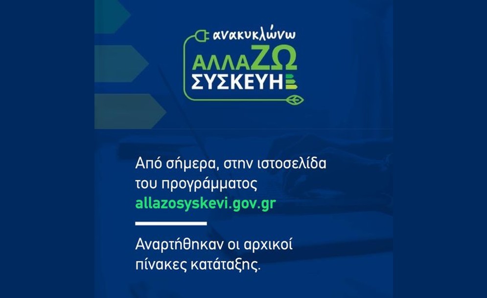 Το Υπουργείο Περιβάλλοντος και Ενέργειας ανακοινώνει ότι τη Τρίτη 21 Ιουνίου, τέθηκε σε λειτουργία η ηλεκτρονική πλατφόρμα https://allazosyskevi.gov.gr/ για την υποβολή αιτήσεων στο Πρόγραμμα ανακύκλωσης και αντικατάστασης ηλεκτρικών συσκευών, «Ανακυκλώνω – Αλλάζω Συσκευή». Η πλατφόρμα...