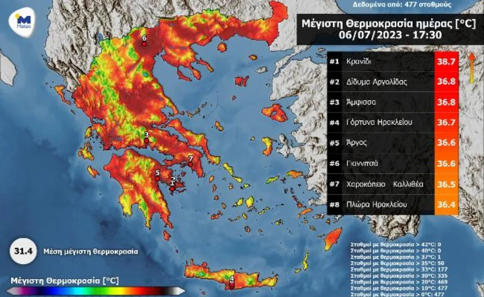 Υψηλές θερμοκρασίες επικράτησαν στη χώρα το μεσημέρι της Πέμπτης 06/07. Οι περιοχές με τις υψηλότερες μέγιστες θερμοκρασίες ήταν η Αργολίδα (Κρανίδι – 38.7°C), η Φωκίδα (Άμφισσα – 36.8°C), το Ηράκλειο (Γόρτυνα Ηρακλείου – 36.7°C),...