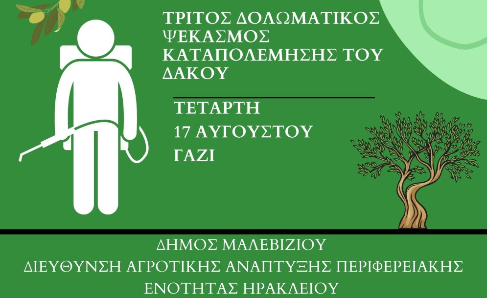Η Δ/νση Αγροτικής Ανάπτυξης, Περιφερειακής Ενότητας Ηρακλείου γνωστοποιεί ότι με την προϋπόθεση των κατάλληλων καιρικών συνθηκών θα ξεκινήσει γενικός δολωματικός ψεκασμός δακοκτονίας στο Δήμο Ηρακλείου Την Τετάρτη 31-08-2022 στις Βασιλειές. Την Κυριακή 04-09-2022 στην Φορτέτσα. Παρακαλούνται όσοι ελαιοπαραγωγοί έχουν περιφραγμένα...