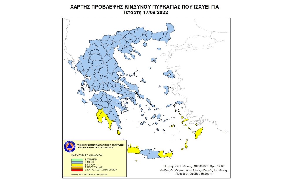 Σύμφωνα με το Χάρτη Πρόβλεψης Κινδύνου Πυρκαγιάς που εκδίδει η Γενική Γραμματεία Πολιτικής Προστασίας του Υπουργείου Κλιματικής Κρίσης & Πολιτικής Προστασίας (www.civilprotection.gr), για τη Τετάρτη 17 Αυγούστου 2022, προβλέπεται υψηλός κίνδυνος πυρκαγιάς (κατηγορία κινδύνου 3) για τις εξής περιοχές: Δωδεκάνησα Χανιά...