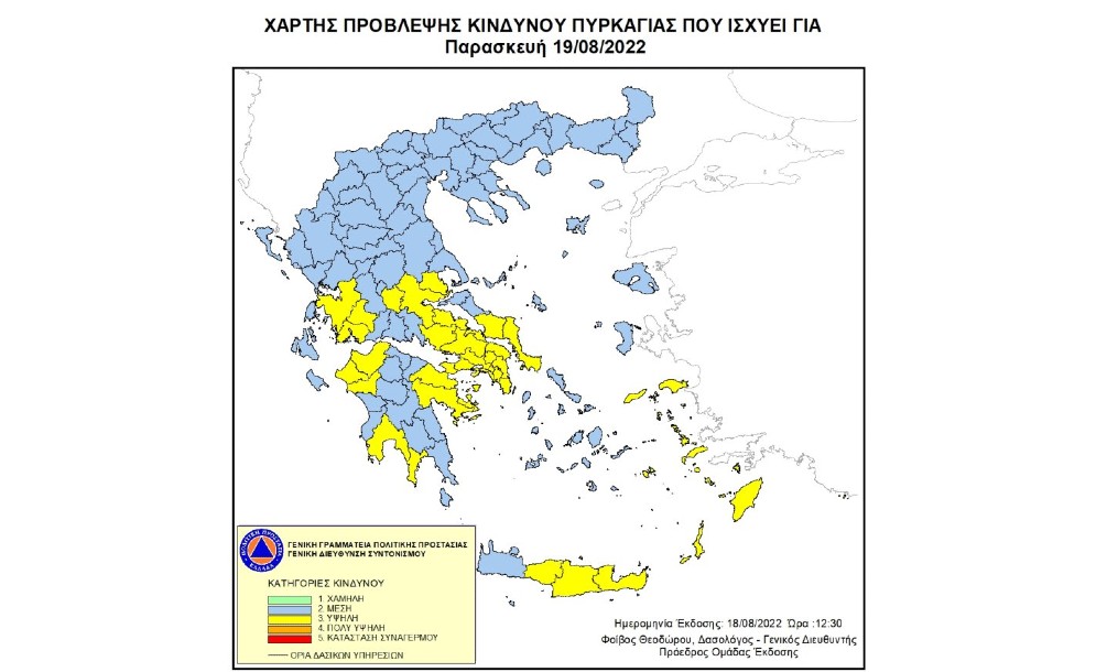 Σύμφωνα με το Χάρτη Πρόβλεψης Κινδύνου Πυρκαγιάς που εκδίδει η Γενική Γραμματεία Πολιτικής Προστασίας του Υπουργείου Κλιματικής Κρίσης & Πολιτικής Προστασίας (www.civilprotection.gr), για τη Παρασκευή 19 Αυγούστου 2022, προβλέπεται υψηλός κίνδυνος πυρκαγιάς (κατηγορία κινδύνου 3) για τις εξής περιοχές: Αττική, Βοιωτία, Φθιώτιδα &...