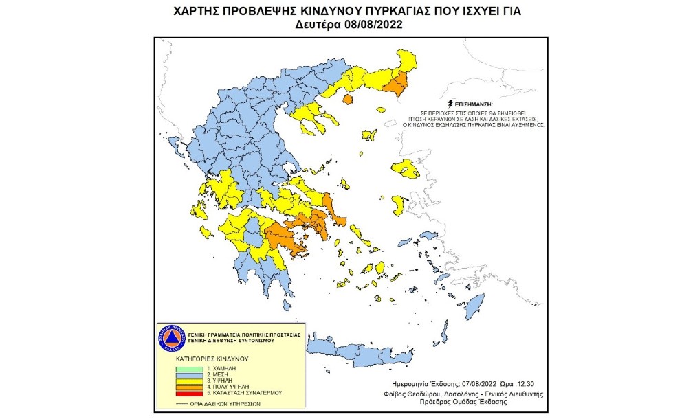 Σύμφωνα με το Χάρτη Πρόβλεψης Κινδύνου Πυρκαγιάς που εκδίδει η Γενική Γραμματεία Πολιτικής Προστασίας του Υπουργείου Κλιματικής Κρίσης & Πολιτικής Προστασίας (www.civilprotection.gr), για τη Δευτέρα 08 Αυγούστου 2022, προβλέπεται πολύ υψηλός κίνδυνος πυρκαγιάς (κατηγορία κινδύνου 4) για τις εξής περιοχές: Περιφέρεια Αττικής Περιφέρεια...