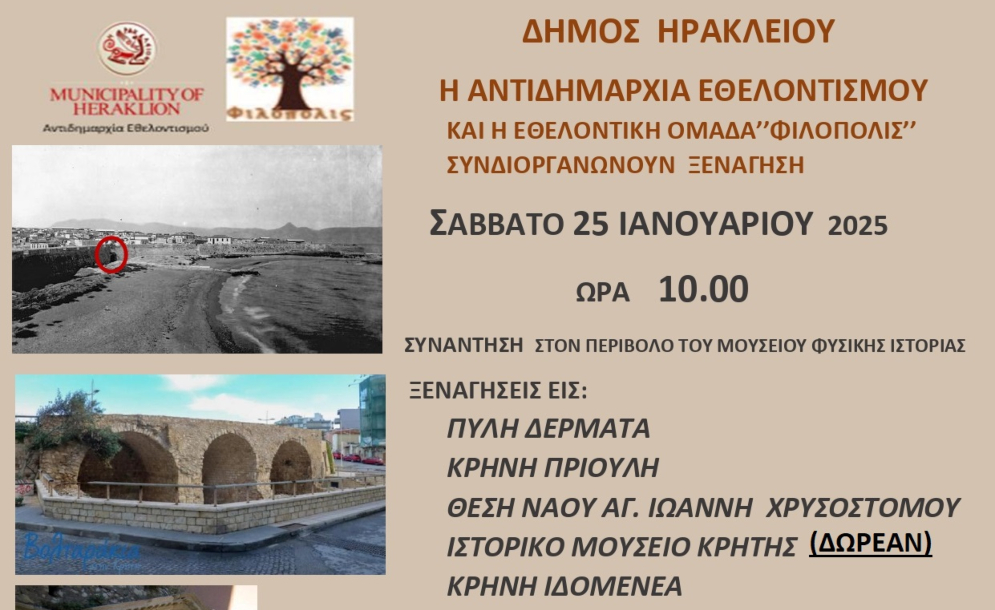 Νέα ξενάγηση στην πόλη του Ηρακλείου θα πραγματοποιηθεί το Σάββατο 25 Ιανουαρίου στο πλαίσιο στο πλαίσιο του δεύτερου κύκλου των δωρεάν ξεναγήσεων που εγκαινίασε ο Δήμος Ηρακλείου και η Αντιδημαρχία Εθελοντισμού σε συνεργασία με...