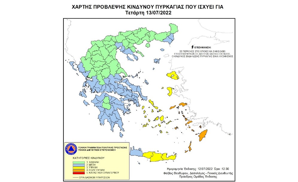 Σύμφωνα με το Χάρτη Πρόβλεψης Κινδύνου Πυρκαγιάς που εκδίδει η Γενική Γραμματεία Πολιτικής Προστασίας του Υπουργείου Κλιματικής Κρίσης & Πολιτικής Προστασίας (www.civilprotection.gr), για Τετάρτη 13 Ιουλίου 2022, προβλέπεται πολύ υψηλός κίνδυνος πυρκαγιάς (κατηγορία κινδύνου 4) για τις εξής περιοχές: Περιφέρεια Νοτίου Αιγαίου (ΠΕ...