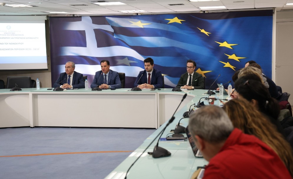 O Υπουργός Ανάπτυξης και Επενδύσεων Άδωνις Γεωργιάδης, ο Αναπληρωτής Υπουργός Νίκος Παπαθανάσης, ο Γενικός Γραμματέας Εμπορίου και Προστασίας του Καταναλωτή Σωτήρης Αναγνωστόπουλος και ο υπεύθυνος του e-ΚΑΤΑΝΑΛΩΤΗΣ Γιάννης Δοξαράς παρουσίασαν τη Τετάρτη 14 Δεκεμβρίου 2022, κατά τη διάρκεια συνέντευξης...
